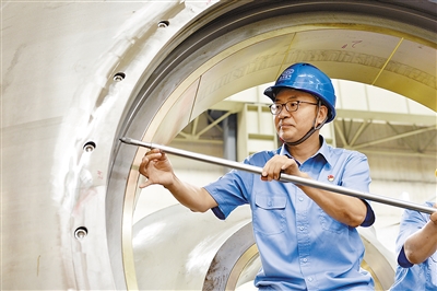 火花四溅,机器轰鸣。转轮装配平台上,崔兴国(见图,本报记者王永战摄)正带领团队成员进行平衡底座校平准备,校平之后,360吨重的转轮就将被安放其上……“为了保证水轮机转轮平稳运行,首先就要实现平衡底座‘零偏差’。”崔兴国介绍。