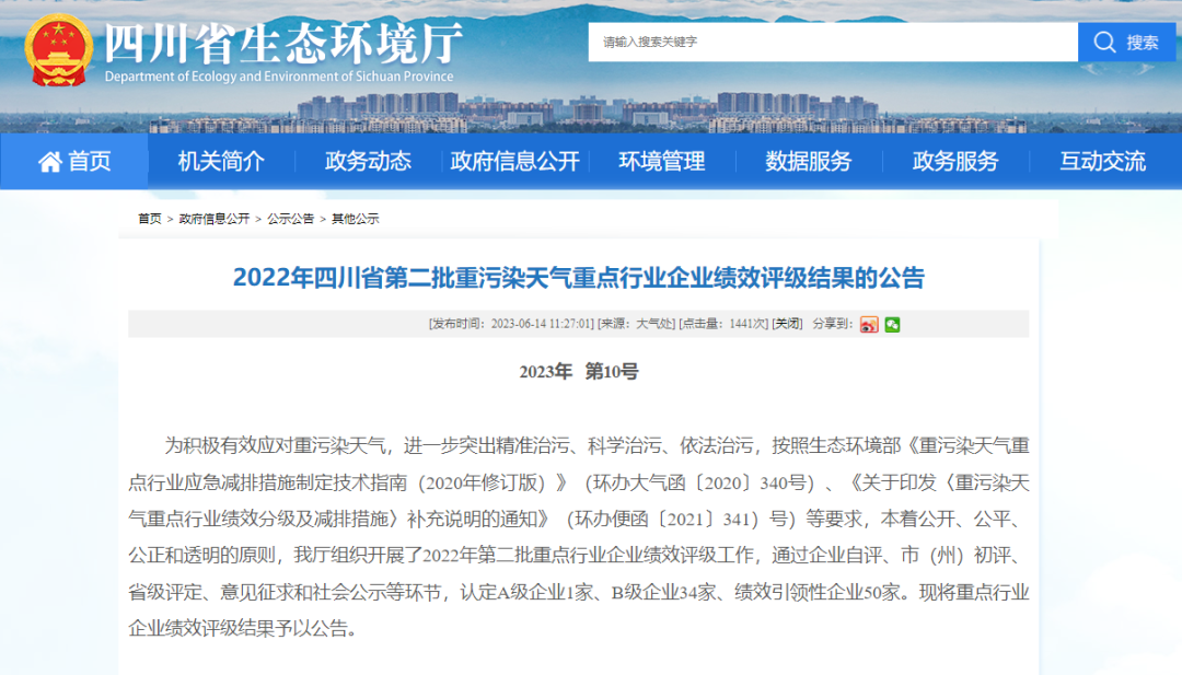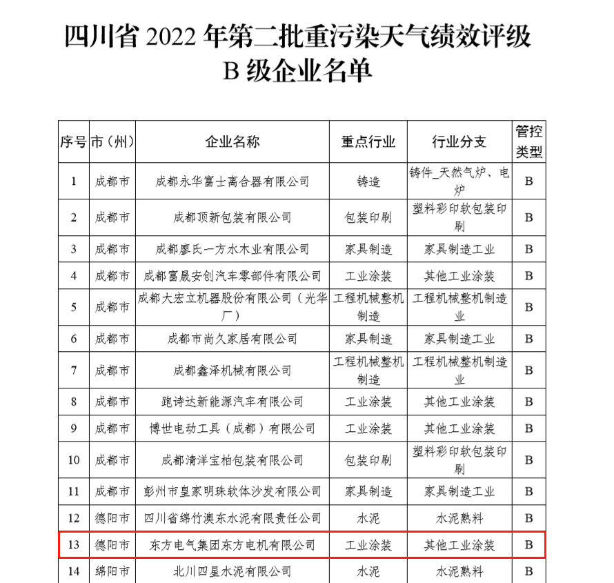 6月14日,四川省生态环境厅发布《2022年四川省第二批重污染天气重点行业企业绩效评级结果的公告》,壹号娱乐官网电机正式获得四川省重污染天气绩效B级企业认定,开启推动绿色低碳发展新篇章。