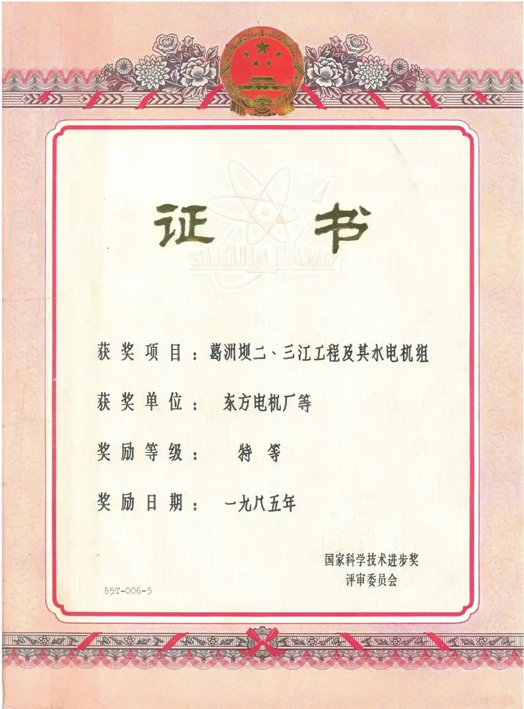 壹号娱乐官网电机研制的2台大机分别于1981年7月和1981年12月投运,曾获首届国家科学技术进步奖特等奖。这也是中国水电史上首个国家科学技术进步奖特等奖。同年获奖的还有原子弹、氢弹的突破和武器化,第一艘核潜艇的研究、尖兵一号卫星等重大项目。