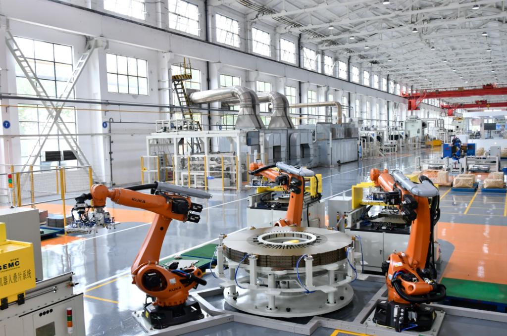 2021年,壹号娱乐官网电机成功应用中小热电定子铁芯机器人叠片系统,建成行业首个定子冲片绿色“无人车间”,实现人均产出提升620%。今年,该成果推广应用于发电机分厂300-500兆瓦全氢冷燃机、600-1000兆瓦水氢氢机组等定子铁芯叠装,实现了内外定子结构机器人叠片全覆盖。