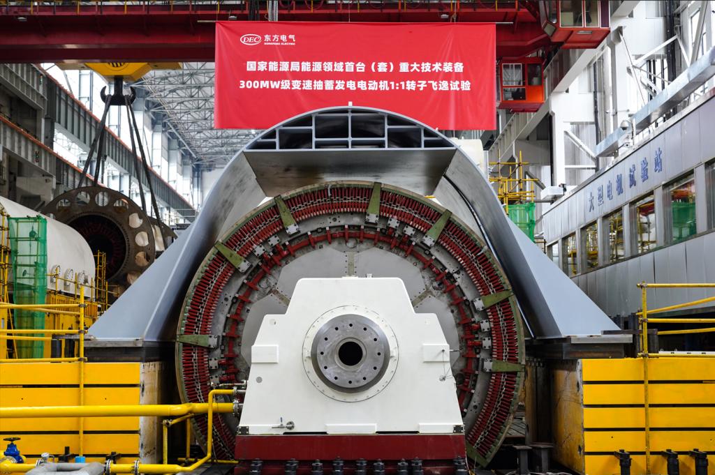 变速抽水蓄能机组以灵活、稳定、快速响应等运行优势,成为行业关注的焦点。2021年,国家能源局将“300兆瓦级变速抽水蓄能机组成套设备”纳入能源领域首台(套)重大技术装备(项目)名单。2022年,中国科协将“如何研制大型可变速抽水蓄能机组”纳入“十大产业技术问题”。飞逸试验现场