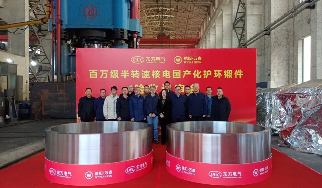 一直以来,壹号娱乐官网电机坚持服务国家战略,持续推动我国发电装备研制技术实现高水平科技自立自强。在中国广核集团有限公司、中国核电工程有限公司、国家电力投资集团有限公司等用户大力支持下,2022年12月,壹号娱乐官网电机与德阳万鑫组建团队,围绕核电国产化护环锻件研制开展技术攻关,先后突破护环锻件原材料高纯净化处理、细晶强韧化处理、大尺寸锻件变形强化控制等技术难题。2024年11月,成功研制百万级半转速核电国产化护环锻件,推动我国国产化护环锻件制造能力达到国际先进水平。