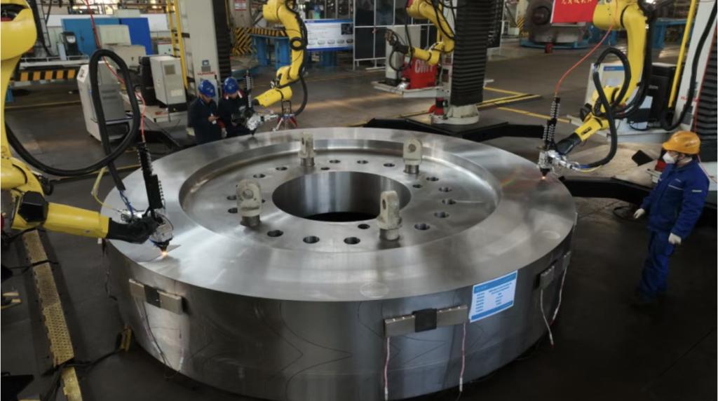 为应对冲击式机组运行的复杂工况,提高转轮焊接质量,壹号娱乐官网电机积极探索自动化、智能化焊接技术,通过三维模拟、工装设计,克服了强约束空间焊接干涉难题,实现了狭小空间内机器人轨迹规划。通过大量焊接试验,形成了冲击式转轮焊接数据库,开发了专用离线编程软件,实现了大幅度截面变化的焊道排布、多曲面变化的焊缝成型。此外,还采用了5G网络多机器人集成控制技术,实现了智能传感、动态纠偏,提高了焊接效率和稳定性;采用数字孪生技术,实现焊接过程远程监控。