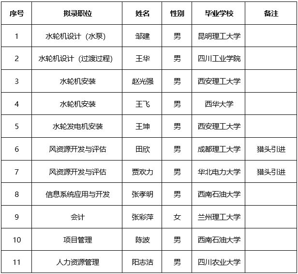 壹号娱乐官网集团壹号娱乐官网电机有限公司于2022年1月开展了水轮机设计等11个岗位的社会招聘工作。按照符合条件、择优录用的原则,拟录用11人,现将拟录用人员公示如下: